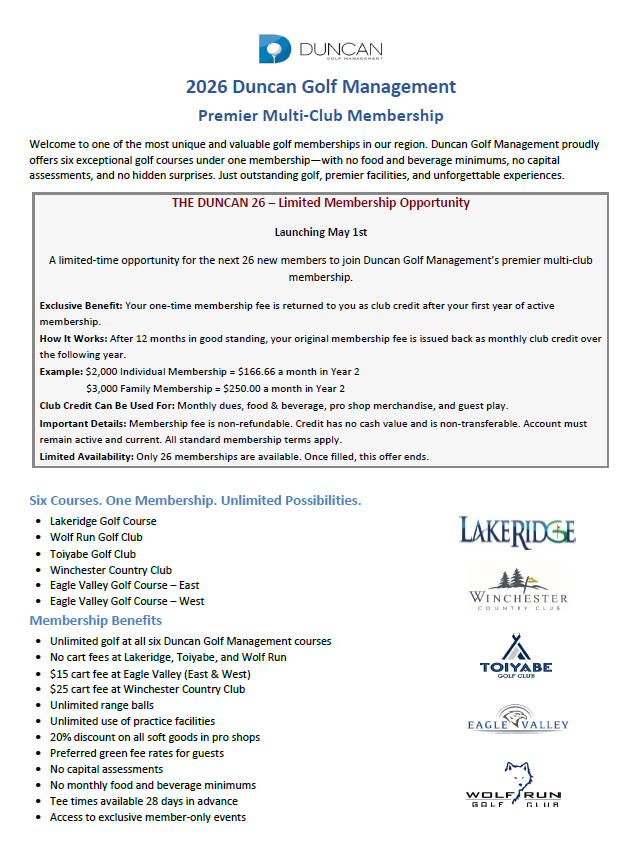 The Duncan 26 is a premier, multi-club membership offering designed for those who want more access, more value, and more connection to the game. Available to just 26 new members, this program delivers all the benefits of our full membership—along with a compelling financial advantage that makes joining now especially rewarding.